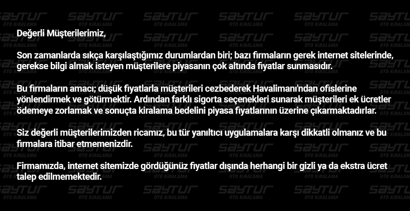 Saytur Oto Kiralama Olarak Her zaman İçin Siz Değerli Müşterilerimize En Uygun ve En Cazip Fiyat Kalitesini Sunarak Sıradan Bir Araç Kiralama Firmalarının Tamamen Dışında Bir Hizmet Verebilmektedir .Bütün Hedefimiz Müşteri Memnuniyeti Odaklı Çalışarak Daha Verimli ve D...
